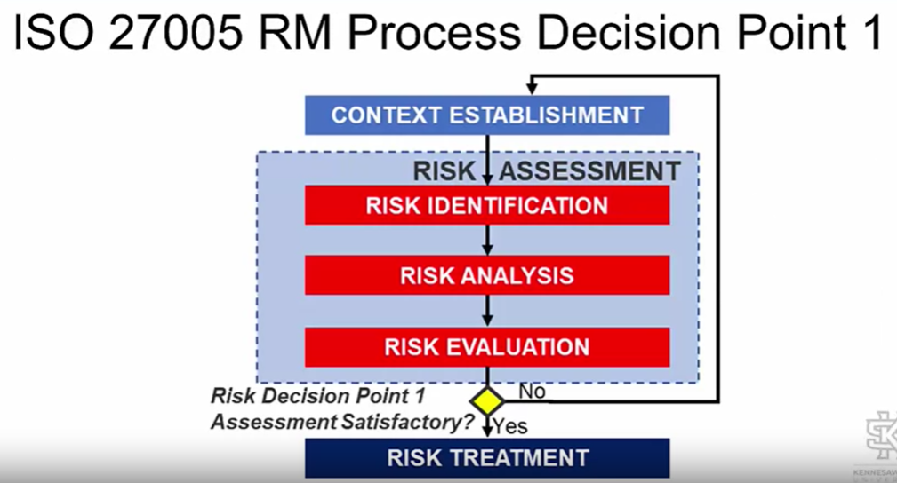 위험 평가 단계 이후에 내리는 첫 번째 결정 사항은 위험 평가가 만족스러웠는지 여부다. 여기서 프로세스 팀은 특정 자산 또는 자산 그룹에 대한 위험 식별, 분석 및 평가에 확신이 있는지 여부를 결정하며, 그렇지 않은 경우 다시 돌아가서 프로세스를 반복하고 상황 평가를 다시 확인한다. 그렇다면 팀은 위험 처리를 진행한다.