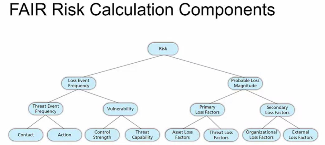위험 계산을 위한 계산 엔진 및 복잡한 위험 시나리오를 분석하기 위한 모델링 구성이 포함된다. 1단계에서는 시나리오 구성 요소를 식별한다. 1단계는 위험에 있는 자산을 식별하는 과정이다. 즉, 위험 분석 내에서 통제 및 가치 특성을 추정하려면 분석가가 평가 대상 자산 또는 객체를 먼저 식별해야 하는 것이다. 다단계 분석을 수행하는 경우, 분석가는 주요 자산 또는 위험에 있는 객체를 식별하고 평가해야 한다. 그리고 주요 자산과 위협 커뮤니티 사이에 존재하는 모든 금속 객체를 식별한다. 2단계는 고려 중인 위협 커뮤니티를 식별하는 것이다. TEF로 알려진 위협 이벤트 빈도를 추정하기 위해 TCap으로 알려진 위협 능력. 악성 행위와 관련된 위험을 평가할 때 특정 위협 커뮤니티를 먼저 식별해야 한다. 분석가는 위협 커뮤니티가 인간인지 아니면 악성 프로그램인지 결정해야 한다. 내부인지, 외부인지도 말이다. 2단계에서는 손실 이벤트 빈도를 평가한다. 3단계는 발생 가능한 위협 이벤트 빈도 또는 TEF를 추정한다. 위협 에이전트가 자산에 대해 조치를 취할 주어진 기간 내의 발생 가능한 빈도다. 이는 매우 낮은 수준에서 매우 높은 수준인 1부터 10까지 또는 조직이 선호하는 모든 것의 척도로 점수를 매길 수 있다. 4단계에서는 위협 능력 또는 TCap을 추정한다. 이것은 위협 에이전트가 자산에 대해 적용할 수 있는 가능한 크기에 대한 것이다. 5단계에서는 기본 수준의 크기에 대해 측정했을 때 주어진 시간 프레임에 대한 제어의 예상 효과인 제어 강도를 추정한다. 6단계에서는 취약성을 도출한다. 이것은 자산이 위협 에이전트의 조치에 저항할 수 없을 확률이다. 이 값은 위협 능력과 제어 강도의 비교 또는 계산에서 도출된다. 다음 7단계에서는 위협, 이벤트 빈도 및 취약성 값의 비교 또는 계산에서 결정된 주어진 기간 내에 위협 에이전트가 자산에 해를 가할 가능성 있는 빈도에 따른 손실을 도출한다. 3단계에서 발생 가능한 손실 크기를 평가하는 것이다. 8단계에서는 최악의 결과를 초래할 가능성이 가장 높은 위협 조치를 결정하는 3단계를 사용하여 결정된 최악의 경우 손실을 추정한다. 이것은 접근의 손실, 오용, 무단 공개, 원치 않는 수정 또는 사용 거부 또는 해당 위협 행동과 관련된 각 손실의 크기를 추정하는 것일 수 있다. 여기에는 생산성 반응, 경쟁 우위, 평판 또는 대체 비용, 벌금 또는 기타 법적 판단의 손실이 포함될 수 있다. 결과적인 손실은 달러 가치로 계산되거나 단순히 너무 심각하고 일부는 너무 낮은 규모로 계산될 수 있다. 크기로 인한 손실은 이전의 두 구성 요소에서 발생 가능한 손실을 계산한다. 9단계에서는 동일한 접근 방식을 사용하여 발생 가능한 손실을 추정한다. 최악의 경우 손실로, 조직은 성공적인 공격으로 인한 가장 가능성 있는 결과를 결정한다. 다음 10단계에서는 추정된 손실 빈도와 추정된 손실 크기를 결합하여 위험 값을 결정하는 위험을 도출하고 명확하게 설명한다. 이는 다시 너무 임계 값이 낮은 값으로 점수가 매겨지거나 수치로 계산될 수 있다.