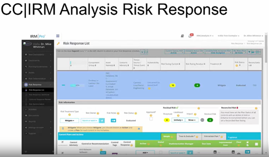 다음으로, 조직은 위험 결정에서 위험 대응으로, 또는 공통적인 위험 관리 용어로 위험 평가에서 위험 처리로 이동한다. 여기서, 조직은 위협, 취약성, 자산, 트라이앵글에 대한 계획된 처리법에 대한 정보를 제공하고, 예상되는 위험의 변화를 결정하기 위해 What-if 추정치를 사용한다. 조직은 현재 통제를 개선하거나 추가 통제를 추가하는 등 변경하기 위한 위험 관리 프로젝트 팀의 권장 사항에 대한 정보를 제공한다. 팀은 자신의 권장 사항이 얼마나 효과적이고 실현 가능한지 추정할 수 있는 분야를 가지고 있다. 또한, 팀은 권장 사항의 예상 비용을 지정할 수 있다. 이전에 다루었던 비용-편익 분석을 여기서 다룰 수 있다. 마지막으로, 경영진이 이러한 권장 사항의 일부 또는 전부를 구현하는 데 동의해야 하며, 팀은 실행 계획을 추적하고, 우선 순위를 지정하고, 통제 구현 또는 개선 사항을 모니터링하는 것에 대해 논의할 수 있다. 소프트웨어에는 전반적인 위험 관리, 프로젝트 진행 상황 및 다른 의사 결정자와 공유할 수 있는 보고서 검토를 위한 대시보드를 포함한 많은 추가 구성 요소가 있다.
