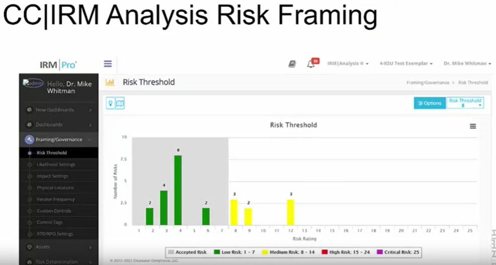 상업용 위험 관리 애플리케이션의 기능을 보여드리기 위해 여기서 Clearwater Compliance Information Risk Management Analysis 애플리케이션 학습한다. Clearwater Compliance는 Bob and Mary Chaput에 의해 2009년에 설립되었다. Clearwater의 원래 사명은 의료 조직이 HIPAA 개인 정보 침해 알림 및 보안 규칙을 준수하고 유지할 수 있도록 지원하는 것이었다. 그러나 의료의 신속한 신기술 구현과 전자 보호 의료 정보의 확산에 대응하여 Clearwater의 사명은 발전했으며, 오늘날 Clearwater Compliance는 의료 기업의 사이버 위험 관리 솔루션을 모두 제공한다. 소프트웨어는 위험 평가 및 위험 관리를 위한 NIST SP 800-30 접근 방식을 기반으로 구축되었다. 위험 관리를 수행하기 위해 조직은 일반적으로 애플리케이션에서 평가할 정보 자산에 대한 리스크 임계값을 정의하는 것부터 시작한다. 위험 임계값은 5배의 영향 가능성 등급을 기준으로 1-25 척도로 점수를 매긴다. 기본 설정은 25배 중 10배이지만 쉽게 조정할 수 있다. 리스크 프레이밍의 일환으로 조직은 영향 설정에서 가능성을 지정하고 왼쪽 여백 메뉴에 표시된 것처럼 기타 전반적인 정보를 제공할 수도 있다.