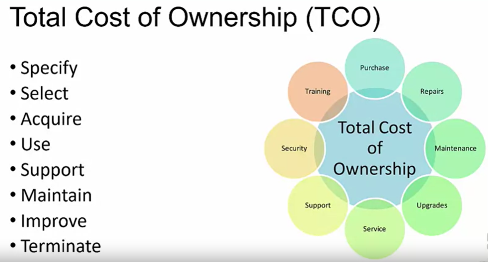 총 소유 비용의 구성 요소는 새로운 또는 개선된 통제 또는 안전 장치의 구현을 포함하여 특정 위험 처리 전략의 비용에 영향을 미치는 항목의 다음 부분 목록을 만든다. 이는 개발 또는 획득 비용이다. 여기에는 하드웨어 비용, 소프트웨어 비용, 구성 비용 및 후속 서비스 비용이 포함되어야 한다. 인력 교육 비용, 변경에 필요한 신규 인력 고용 비용도 말이다. 구현 비용에는 하드웨어, 소프트웨어 및 서비스의 설치, 구성, 테스트가 포함된다. 서비스 비용에는 일반적으로 유지 보수 및 업그레이드에 대한 공급업체 수수료 또는 정보 자산 보호 또는 보험 또는 기타 관련 비용이 포함된다. 유지 보수 비용과 업그레이드에 필요한 장비와 직원 및 소프트웨어를 확인하고 지속적으로 테스트, 유지 보수, 교육 및 업데이트하는 데 드는 인건비도 포함된다. 이는 최종적으로 서비스를 제거하거나 공격으로 인해 어느 시점에 타협할 때 자산 손실로 인한 잠재적 비용이다. 개별 조직과 특정 기술에는 식별되고 문서화되어야 하는 특정 자산 집합에 대한 기타 비용이 포함될 수 있다.