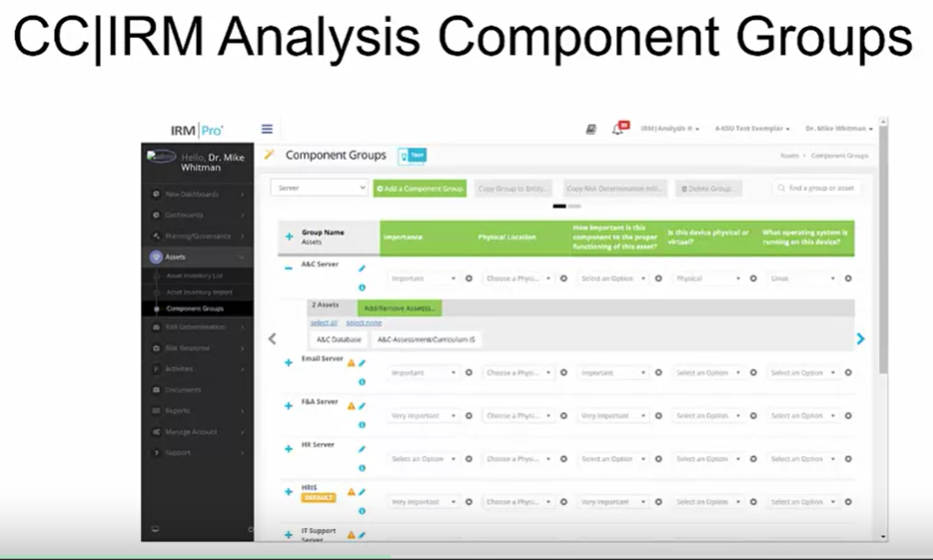 조직의 다음 작업은 위험을 관리하고자 하는 정보 자산 또는 기타 자산 그룹을 입력하는 것이다. 각 자산 입력 화면에는 자산의 위치, 소유자, 자산 수 및 유형뿐만 아니라 자산의 복구 시간 및 복구 시점 목표를 포함한 자산을 설명하는 다양한 필드가 있다. 정보 자산을 지정하는 것 외에도 구성 요소 그룹이 정의되고 구성 요소와 관련된 정보 자산이 카탈로그화된다. 정보 자산을 저장, 사용, 처리 및 전송하는 데 사용되는 물리적 자산을 고려해 생각해 보면 된다. 여기에는 자산이 상주하는 서버, 라우팅되는 네트워킹 장치, 자산에 액세스하는 사용자 시스템 등이 포함된다. 소프트웨어의 핵심 기능 중 하나는 미디어라고 알려진 구성 요소의 알려진 취약성을 파악한 다음, 이러한 취약성을 정보 자산에 적용하여 평가하는 것이기 때문에 중요하다. 이는 특정 소프트웨어 취약성을 추적하는 것이 아니라 평가하고 해결해야 하는 일반적인 범주의 취약성을 추적한다. 조직이 CCIRM 분석을 사용하여 위험 평가를 완료하면, 모든 애플리케이션 및 운영 체제 특정 취약성도 고려해야 한다. 모든 정보 자산이 입력되고 관련 구성 요소 그룹이 결정되면 조직은 CCIRM 분석에서 위험 설문지를 사용하여 위험 결정으로 알려진 위험 평가를 수행한다. 소프트웨어는 각 잠재적 위협, 취약성 및 자산 트라이앵글을 살펴보고 사용자에게 일련의 모범 사례 컨트롤이 구현되었는지 또는 진행 중인지 묻는다. 조직이 사용자 지정 컨트롤 또는 권장 사항을 입력할 수 있는 버튼이 있는데, 이 정보를 입력하면 소프트웨어는 사용자가 이 트라이앵글에 대해 현재 추정된 가능성과 영향 수준을 지정할 수 있다. 이는 조직이 첫 번째 단계에서 정의한 사용자 지정 대안을 기반으로 할 수 있다. 가능성과 영향에 대한 결과 계산은 현재 위험 등급을 제공한다.