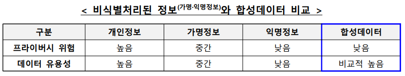반면, '합성데이터'는 실제 데이터의 특성만 참조하여 실제 개인과 직접적인 관련이 없는 완전히 새로운 데이터셋을 생성해내는 방식임.