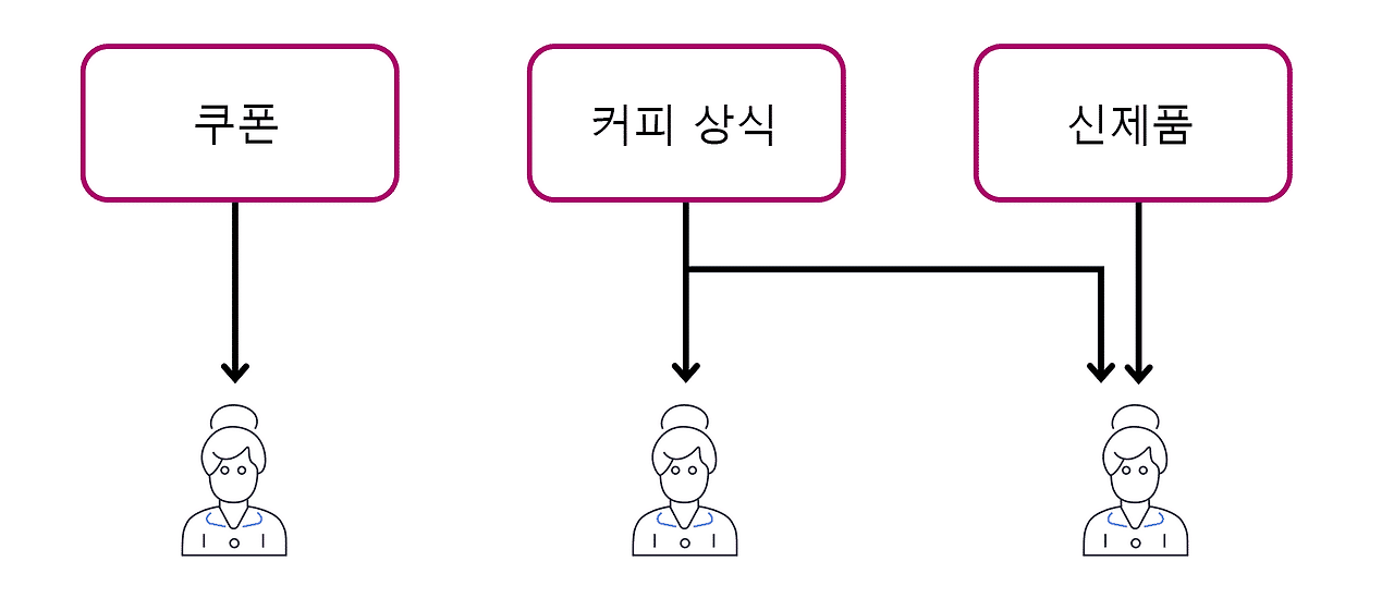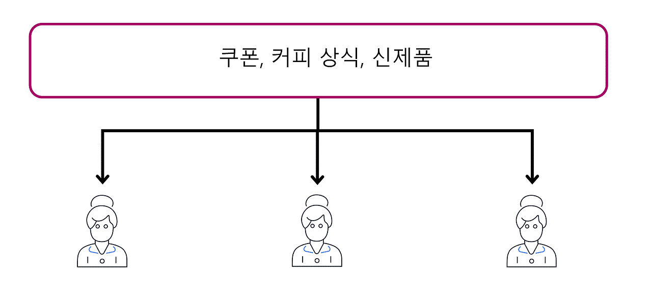 ② 여러 주제에서 업데이트 게시: 이제 카페는 모든 주제를 다루는 단일 뉴스레터 대신 이를 3개의 뉴스레터로 나눴다. 각 뉴스레터는 쿠폰, 커피 상식, 신제품과 같은 특정 주제만을 다룬다. 이제 구독자는 구독한 특정 주제에 대해서만 즉시 업데이트를 받게 된다. 구독자는 주제를 하나 또는 여러 개 구독할 수 있다. 예를 들어 첫 번째 고객은 쿠폰 주제만 구독하고 두 번째 구독자는 커피 상식 주제만 구독한다. 세 번째 고객은 커피 상식 주제와 신제품 주제를 구독힌다.