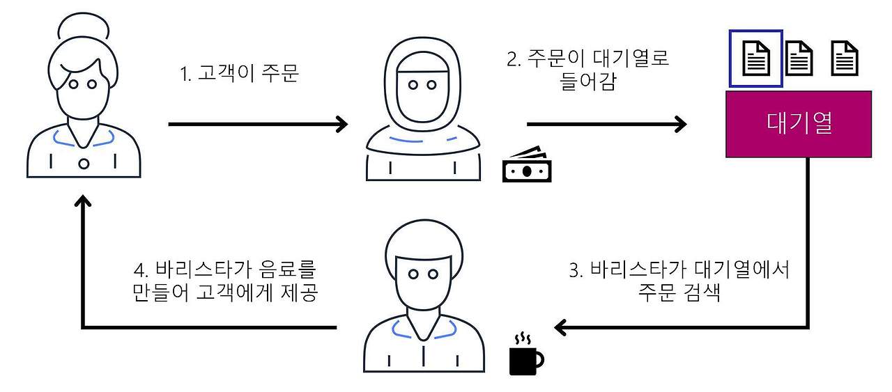 ① 주문 이행: 직원이 주문을 받고 바리스타가 주문 음료를 만드는 주문 프로세스가 카페에 있다고 가정해 본다. 직원과 바리스타가 애플리케이션의 두 가지 개별 구성 요소라고 생각한다. 먼저 직원이 주문을 받아 주문지에 적는다. 그런 다음 직원이 바리스타에게 주문지를 전달한다. 마지막으로 바리스타가 음료를 만들어 고객에게 제공한다. 다음 주문을 받으면 이 프로세스가 반복된다. 이 프로세스는 계산원과 바리스타가 함께 조율되는 한 원활하게 진행될 것이다. 만약 직원이 주문을 받아 바리스타에게 전달하려는데 바리스타가 쉬는 시간이거나 다른 주문으로 바쁘다면 어떻게 될까? 직원은 바리스타가 주문을 받을 준비가 될 때까지 기다려야 할 것이다. 그러면 주문 프로세스가 지연되고 고객은 주문한 음료를 받을 때까지 더 오래 기다려야 한다. 카페의 인기가 많아지고 주문하려는 고객의 줄이 줄어드는 속도가 더 느려지면 점주는 현재 주문 프로세스가 시간이 많이 걸리고 비효율적이라는 것을 알게 될 것이다. 따라서 점주는 대기열을 사용하는 다른 접근 방식을 시도하기로 결정할 수 있다.