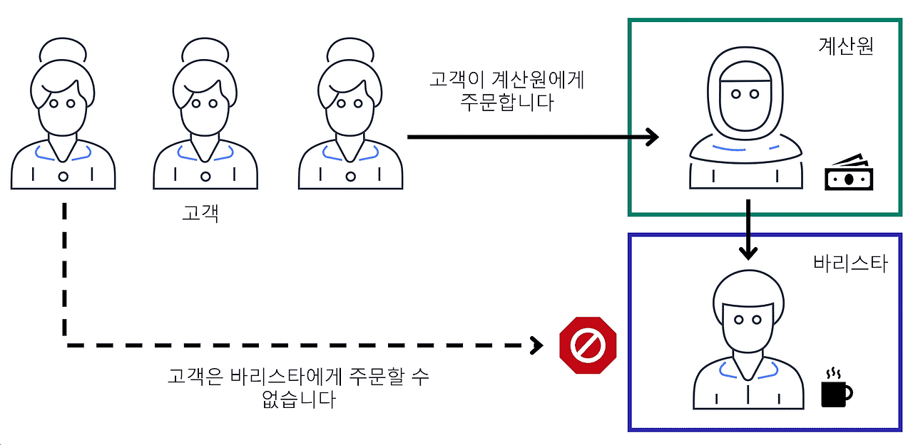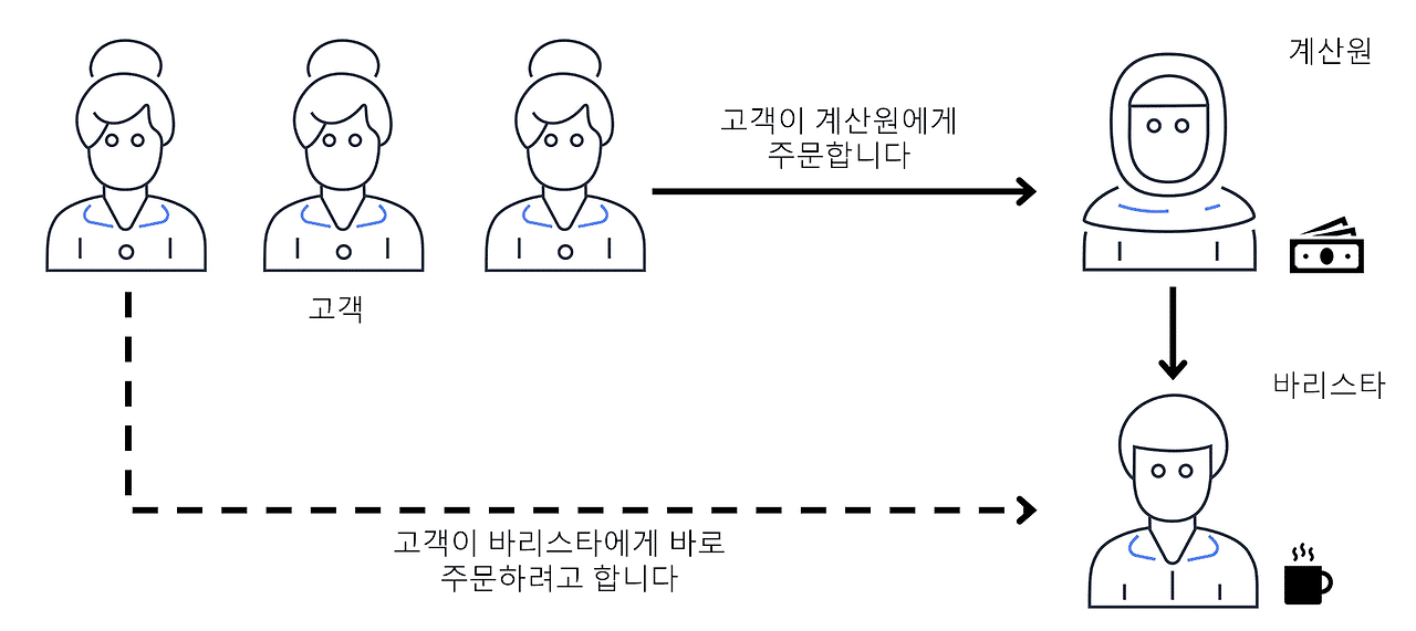 VPC 내에서 서브넷의 역할에 대해 자세히 알아보기 위해 위 그림과 같은 카페의 예를 살펴본다. 먼저, 고객이 직원에게 음료를 주문한다. 그러면 직원이 바리스타에게 주문을 전달한다. 이 프로세스를 통해 더 많은 고객이 들어오더라도 계속 원활하게 주문을 받을 수 있다. 만일 일부 고객이 직원을 건너 뛰고 바리스타에게 직접 주문하려 한다면, 주문 흐름이 중단되고 고객이 카페의 제한 구역에 접근하게 된다.