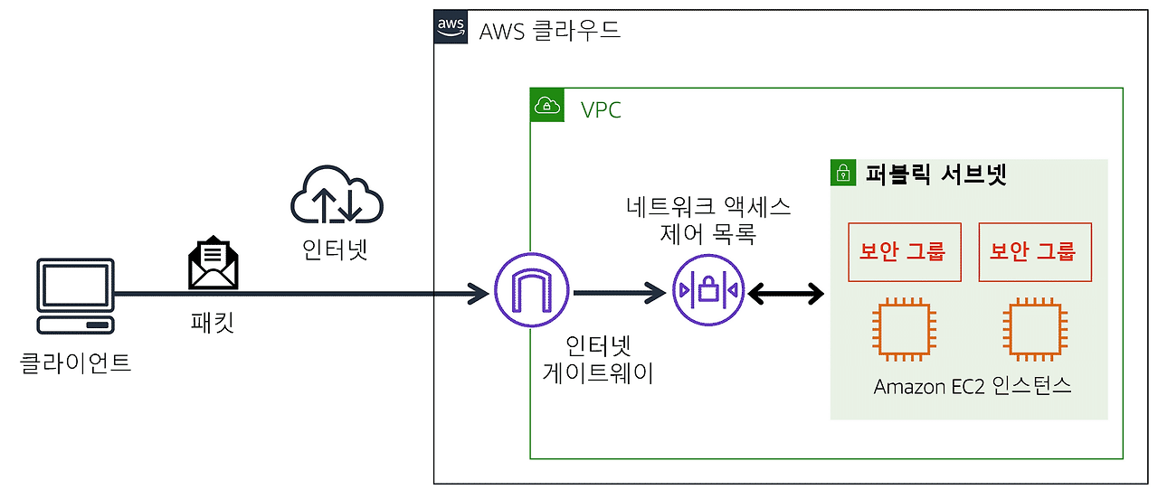 보안 그룹은 Amazon EC2 인스턴스에 대한 인바운드 및 아웃바운드 트래픽을 제어하는 가상 방화벽이다. 기본적으로 보안 그룹은 모든 인바운드 트래픽을 거부하고 모든 아웃바운드 트래픽을 허용한다. 그렇게 사용자 지정 규칙을 추가하여 허용해야 할 트래픽을 구성할 수 있다. 그러면 나머지 트래픽은 거부된다. 예를 들어 로비에서 방문객을 안내하는 경비원이 있는 아파트 건물을 생각해 보도록 한다. 방문객을 패킷으로 생각할 수 있으며 경비원을 보안 그룹으로 생각할 수 있다. 방문객이 도착하면 경비원은 방문객 목록을 보고 해당 방문객이 건물 안으로 들어갈 수 있는지 확인한다. 그러나 방문객이 건물에서 나갈 때는 경비원이 목록을 다시 확인하지 않는다. 동일한 VPC 내에 여러 Amazon EC2 인스턴스가 있는 경우 동일한 보안 그룹에 연결하거나 각 인스턴스마다 서로 다른 보안 그룹을 사용할 수 있다.