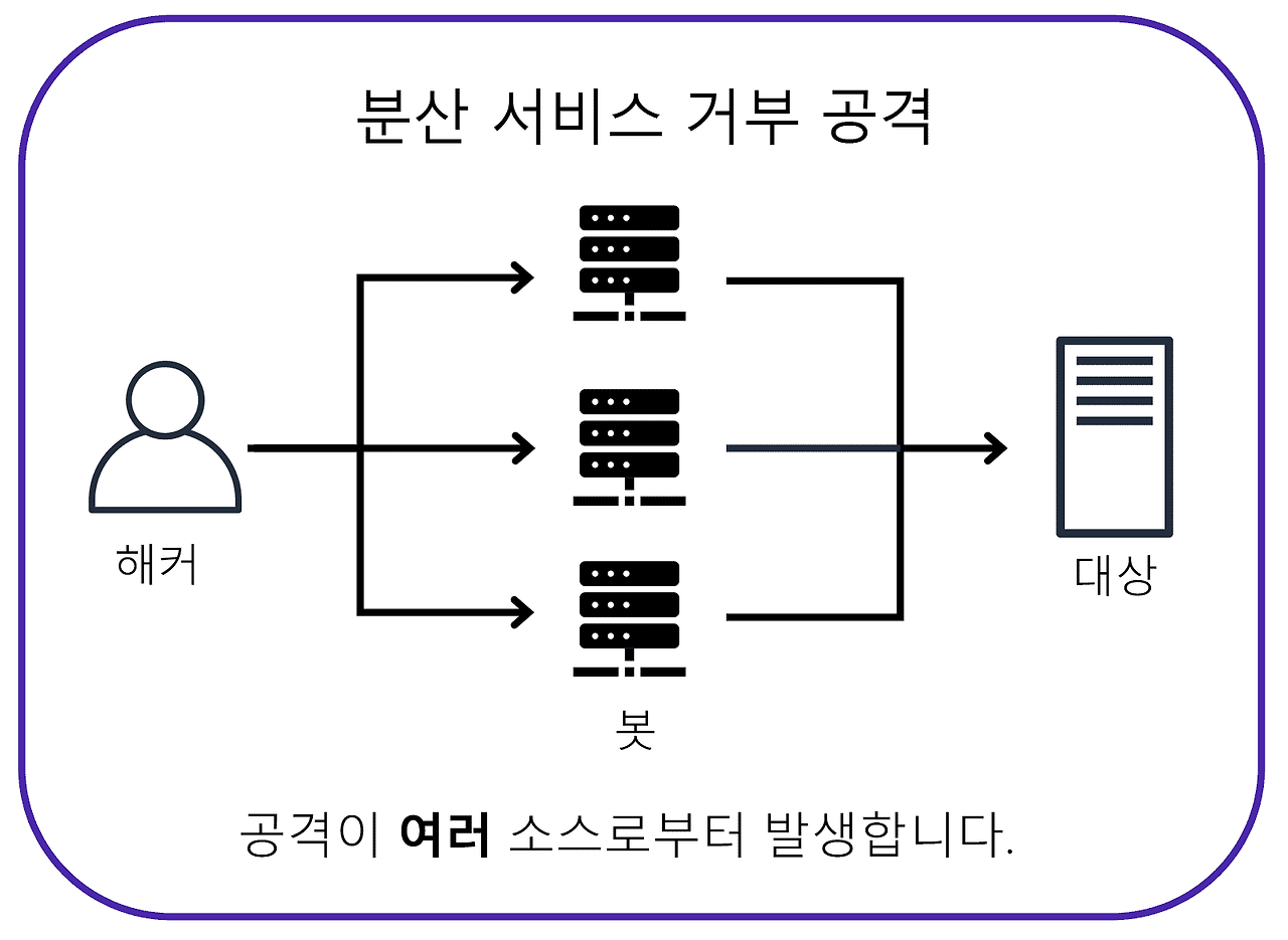 이제, 장난꾸러기가 친구의 도움을 받게 되었다고 가정한다. 장난꾸러기와 그 친구들은 픽업할 의사는 없지만 반복적으로 카페에 전화를 걸어 주문을 한다. 이러한 요청은 서로 다른 전화번호로 들어오고 있으므로 카페에서 모든 전화번호를 차단하는 것은 불가능하다. 또한 걸려 오는 전화가 증가했기 때문에 고객이 전화를 거는 것이 점점 더 어려워졌다. 이는 분산 서비스 거부 공격과 유사하다. 분산 서비스 거부(DDoS) 공격에서는 여러 소스를 사용하여 웹 사이트 또는 애플리케이션을 사용할 수 없게 만드는 공격을 시작한다. 공격자는 그룹일 수도 있고 심지어 한 명일 수도 있다. 단일 공격자는 감염된 여러 컴퓨터(=봇)를 사용하여 과도한 트래픽을 웹 사이트 또는 애플리케이션으로 전송할 수 있다. DoS 및 DDoS 공격이 애플리케이션에 미치는 영향을 최소화하기 위해 AWS Shield를 사용할 수 있다.
