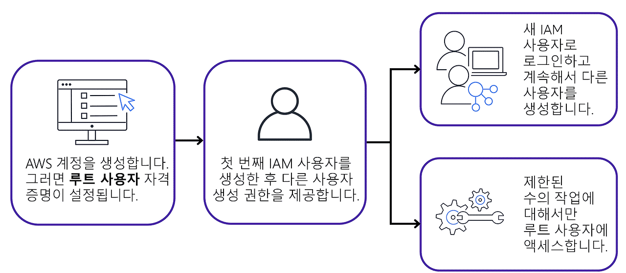 그러나 일상 작업에는 루트 사용자를 사용하지 말아야 한다. 대신 루트 사용자를 사용하여 첫 번째 IAM 사용자를 생성하고 이 사용자에게 다른 사용자를 생성할 수 있는 권한을 할당해야 한다. 계속해서 다른 IAM 사용자를 생성하고 AWS 전체에서 일상 작업을 수행할 때 이러한 자격 증명에 액세스한다고 생각하면 된다. 루트 사용자만 사용할 수 있는 제한된 종류의 작업을 수행해야 하는 경우에만 루트 사용자를 사용해야 한다. 이러한 작업에는 루트 사용자 이메일 주소 변경, AWS Support 플랜 변경 등이 있다.