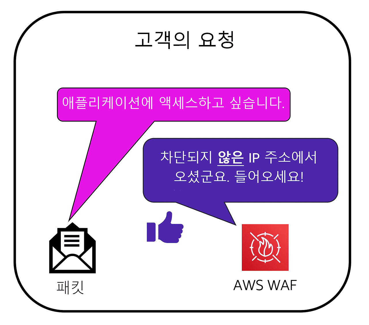 애플리케이션이 여러 IP 주소에서 악의적인 네트워크 요청을 받고 있다고 가정한다. 이러한 요청이 애플리케이션에 계속 액세스하는 것을 방지해야 하지만 합법적인 사용자는 여전히 애플리케이션에 액세스할 수 있도록 해야 한다. 지정한 IP 주소에서 나온 요청을 제외한 모든 요청을 허용하도록 웹 ACL을 구성한다. AWS WAF는 요청이 들어오면 웹 ACL에서 구성한 규칙 목록을 확인한다. 요청이 차단된 IP 주소 중 하나에서 나오지 않았으면 애플리케이션에 대한 액세스를 허용한다.
