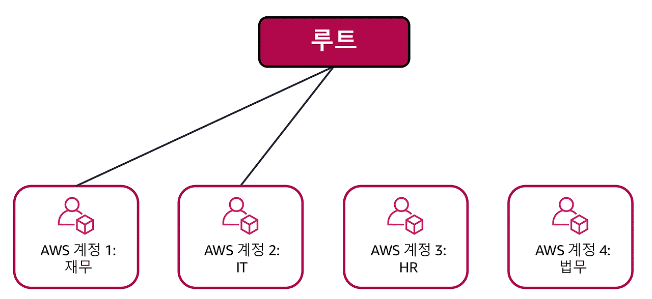 재무, 정보 기술(IT), 인사(HR) 및 법무 부서에 별도의 AWS 계정이 있다고 가정한다. 중앙 위치에서 관리할 수 있도록 이러한 계정을 단일 조직으로 통합하기로 결정한다. 조직을 만들면 루트가 설정된다. 조직을 설계할 때 각 부서의 비즈니스, 보안 및 규정 요구 사항을 고려한다. 이 정보를 사용하여 OU에서 함께 그룹화할 부서를 결정한다.
