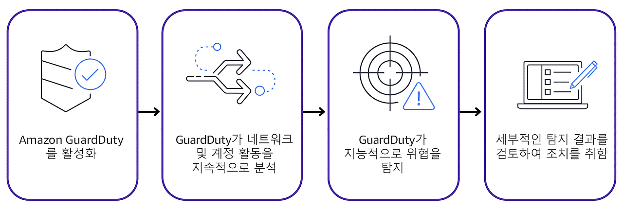 Amazon GuardDuty는 AWS 인프라 및 리소스에 대한 지능형 위협 탐지 기능을 제공하는 서비스다. 이 서비스는 AWS 환경 내의 네트워크 활동 및 계정 동작을 지속적으로 모니터링하여 위협을 식별한다.