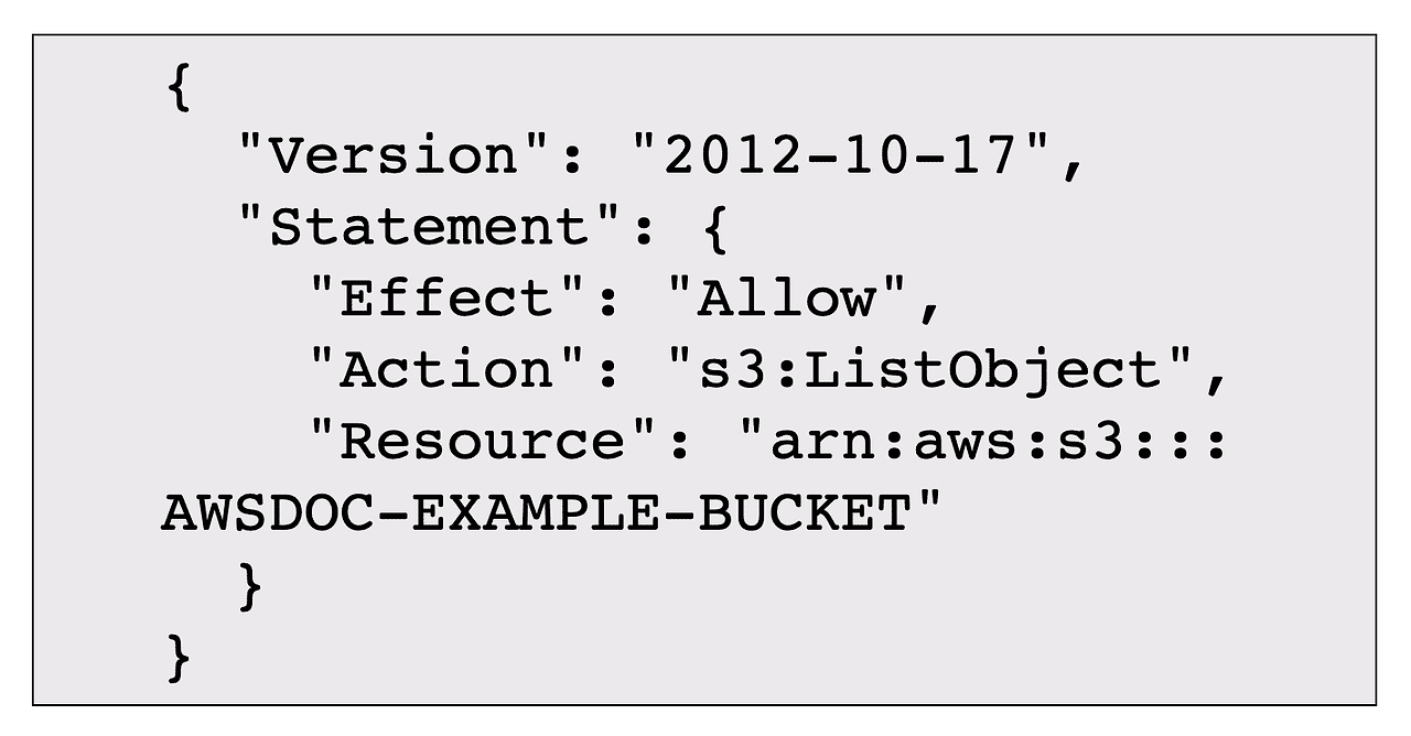 다음은 IAM 정책이 작동하는 방식의 예시다. 카페 점주가 새로 채용한 점원을 위해 IAM 사용자를 생성해야 한다고 가정해 본다. 이 직원은 ID가 AWSDOC-EXAMPLE-BUCKET인 Amazon S3 버킷에 저장된 영수증에만 액세스하면 된다. 이 예제의 IAM 정책은 Amazon S3: ListObject 내에서 특정 작업을 허용한다. 또한 이 정책에는 특정 버킷 ID: AWSDOC-EXAMPLE-BUCKET도 언급되어 있다. 점주가 직원의 IAM 사용자에 이 정책을 연결하면 해당 계산원은 AWSDOC-EXAMPLE-BUCKET 버킷의 모든 객체를 볼 수 있다.