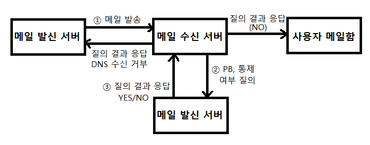 스팸 메일 차단 시스템은 일반적으로 광고성 메일 및 음란 메일과 같은 유해한 메일을 발송하는 IP를 차단하는 RBL(Real Time Blocking List)과 SPF(Sender Policy Framework)가 있다.