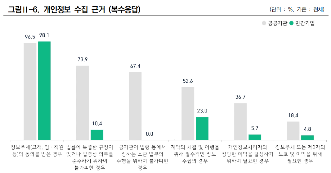 개인정보 보호법에서는 개인정보자기결정권을 실현하도록 하는 주된 수단으로 동의 제도를 채택하고 있다. 사실 일상에서도, 일을 하면서도, 동의 제도를 채택하지 않는 곳은 아직 본 적이 없다. 그리고 개보위와 KISA가 진행한 <2022 개인정보보호 및 활용조사>에 따르면, 개인정보 수집 근거로 정보주체의 동의를 활용하는 경우가 공공기관은 96.5%, 민간기업은 98.1%에 달한다고 한다. 자세한 내용은 아래와 같다.