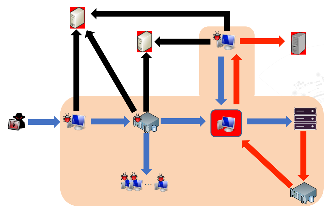 스피어 피싱 공격의 진행 시나리오: 공격이 들어와 특정 PC A를 감염시키고, 아웃바운드 통신으로 정보가 해커의 서버에 전달됨. 그리고 해커는 PC의 프로세스나 하드디스크 등을 통해 NAS를 쓴다는 것을 알게 되고, NAS를 통해 측면이동을 하게 됨. (* 방어자 입장에서는 이 측면이동을 잡아내는 것이 중요함) NAS가 감염되면, NAS에 붙어있는 모든 사용자 PC가 감염되게 됨. NAS의 경우 인바운드, 아웃바운드 모두 차단해야 하지만, 인바운드만 차단하는 곳이 대다수임. 아웃바운드를 차단하지 못하는 이유는 워낙 많은 사람들이 다양한 사이트를 돌아다니기 때문임. NAS에 붙어있는 사용자들을 모두 감염하다 보면 DB관리자의 PC도 감염이 되고, 이는 결국 망분리 결함으로 지적되는 사항임. 왜냐하면, DB관리자의 PC가 인바운드/아웃바운드 모두 차단이 되어있어도 NAS를 통해 감염이 될 수 있기 때문임. 이후 해커는 RDP 접속이력이 있는 PC를 확인하여 연결을 시도함. (* RDP를 사용할 때만이 아닌, 계속 열어두는 것도 결함임) 그렇게 DB PC를 제어하게 되고, 기밀정보를 탈취하는 데 성공함. 마찬가지로 VPN을 통해 들어오고, 게이트웨이를 통해 들어옴.