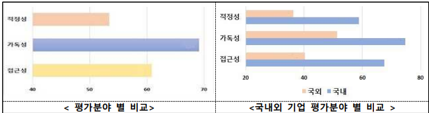 또한 12개의 해외사업자의경우 개인정보 공유·협력 등 국내법‧정책과 다르게 표현하거나, 번역투 문장사용 등으로 인해 가독성, 접근성, 적정성 모든 분야에서 국내 기업 대비 낮은 평가를 받았다. 아무래도 이는 관심의 차이가 클 것이다.