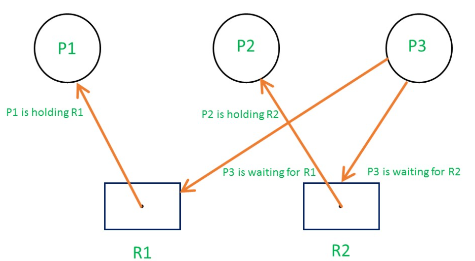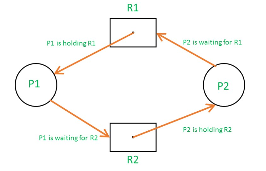 프로세스와 자원들이 원형을 이루며, 각 프로세스는 자신에게 할당된 자원을 가지면서 상대방 프로세스의 자원을 상호 요청하는 것이다. 순환 대기라고도 부른다.