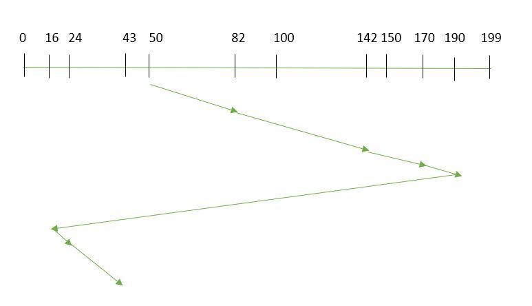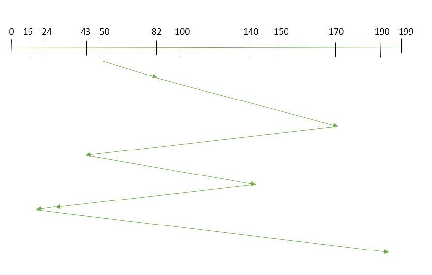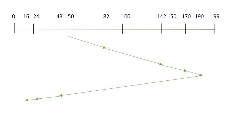 위 그림에서 현재 위치는 50이고, 요청 순서는 82, 170, 43, 140, 24, 16, 190이 된다.