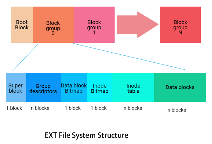 EXT 파일 시스템은 부트 블록, 블록 그룹 0(수퍼 블록, 그룹 디스크립터, 데이터 블록 비트맵, i-node 비트맵, i-node 테이블 및 데이터 블록 포함) 및 블록 그룹 n을 포함하여 하나의 블록과 두 개의 그룹으로 나눌 수 있다.