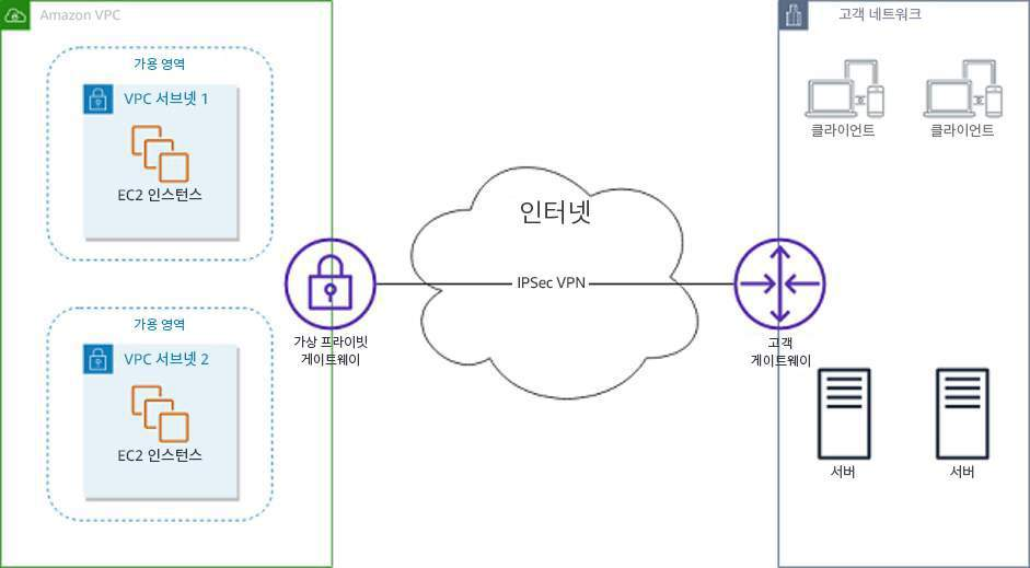 가상 프라이빗 게이트웨이의 경우, VPC를 다른 프라이빗 네트워크에 연결한다. 가상 프라이빗 게이트웨이를 생성하여 VPC에 연결할 때 게이트웨이가 연결의 AWS 측에서 앵커 역할을 한다. 연결의 다른 쪽에서는 고객 게이트웨이를 나머지 프라이빗 네트워크에 연결해야 한다. 고객 게이트웨이 디바이스는 연결을 위해 고객 측에 설치된 물리적 디바이스 또는 소프트웨어 애플리케이션이다. 두 게이트웨이가 모두 있으면 양측 사이에 암호화된 가상 프라이빗 네트워크(VPN) 연결을 설정할 수 있다.