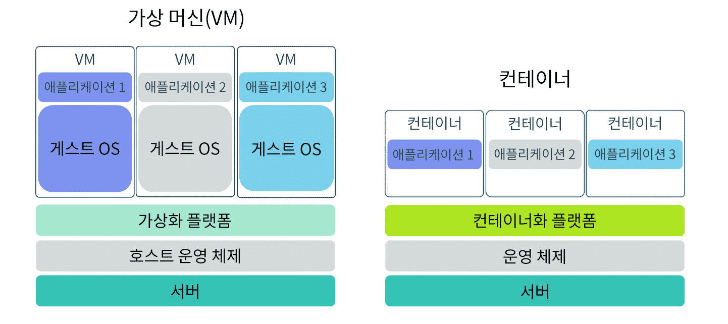 컨테이너는 컨테이너가 존재하는 호스트와 동일한 운영 체제와 커널을 공유한다. 그러나 가상 머신은 자체적으로 운영 체제를 포함하고 있다. 각 가상 머신은 운영 체제의 복사본을 유지 관리해야 하므로 리소스가 낭비되는 것이다.