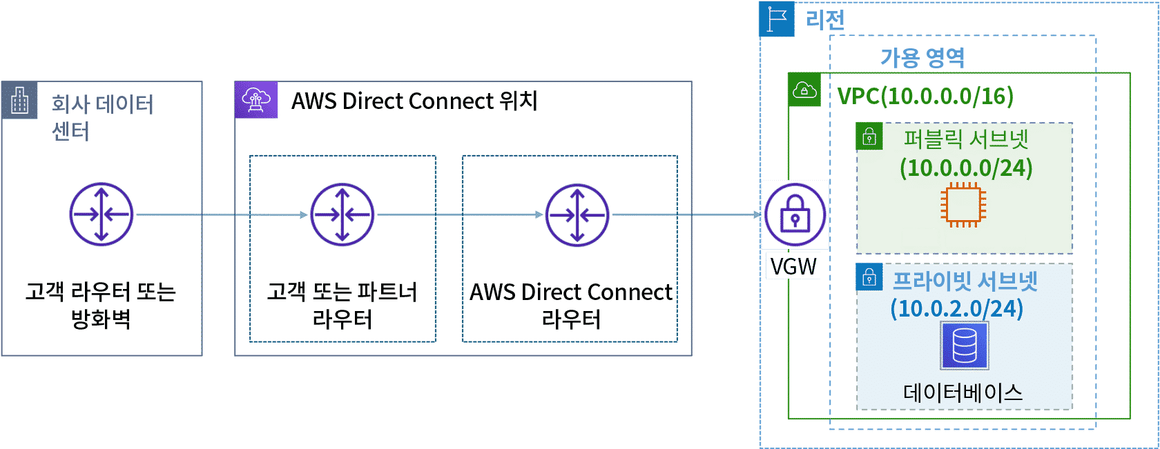 온프레미스 데이터 센터와 Amazon VPC 간에 물리적 보안 연결을 설정하려는 경우, AWS Direct Connect를 사용할 수 있다. AWS Direct Connect를 사용하면 표준 이더넷 광섬유 케이블을 통해 고객의 내부 네트워크가 AWS Direct Connect 위치에 연결된다. 이 연결을 사용하여 퍼블릭 AWS 서비스 또는 고객의 VPC에 직접 가상 인터페이스를 생성할 수 있는 것이다.