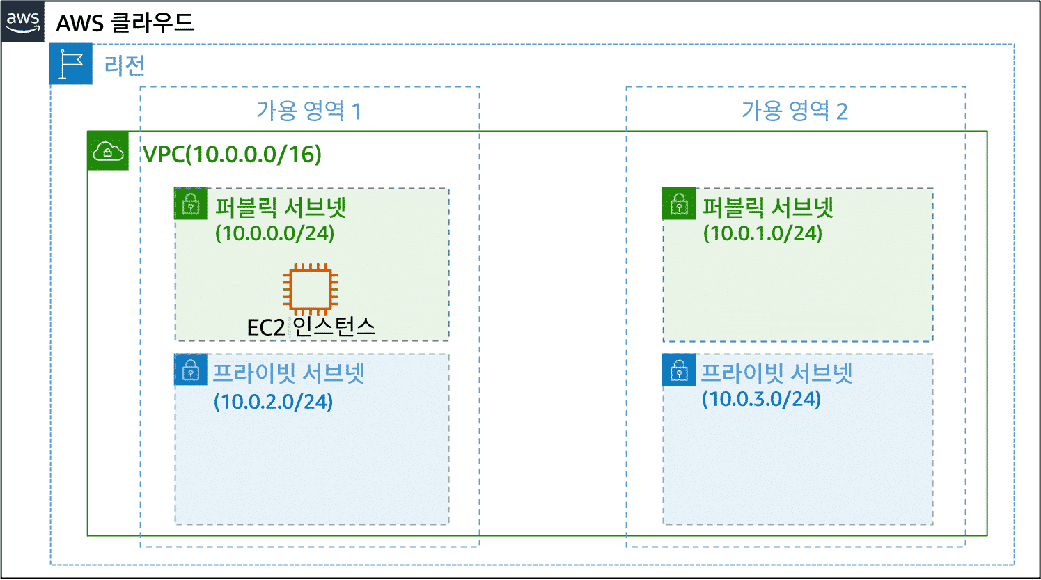 ① VPC의 이름 ② VPC가 상주할 리전 : VPC는 선택한 리전의 모든 가용 영역에 걸쳐 있다.③ CIDR 표기법으로 표기한 VPC의 IP 범위 : 이 범위가 네트워크의 크기를 결정한다. 각 VPC에는 최대 5개의 CIDR이 있을 수 있다. 기본 범위 1개, IPv4의 보조 범위 4개로 말이다.