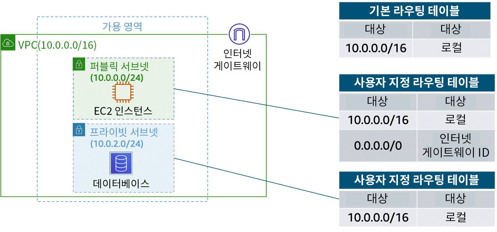 기본 라우팅 테이블은 명시적 라우팅 테이블 연결이 없는 서브넷이 암시적으로 사용한다. 그러나 트래픽이 VPC 외부의 리소스에 액세스하도록 서브넷별로 다른 라우팅을 제공하고 싶을 수도 있지 않은가? 예를 들어, 애플리케이션이 프런트엔드와 데이터베이스로 구성되었다면 리소스에 대해 별도의 서브넷을 생성하고 각기 다른 라우팅을 제공할 수 있다.