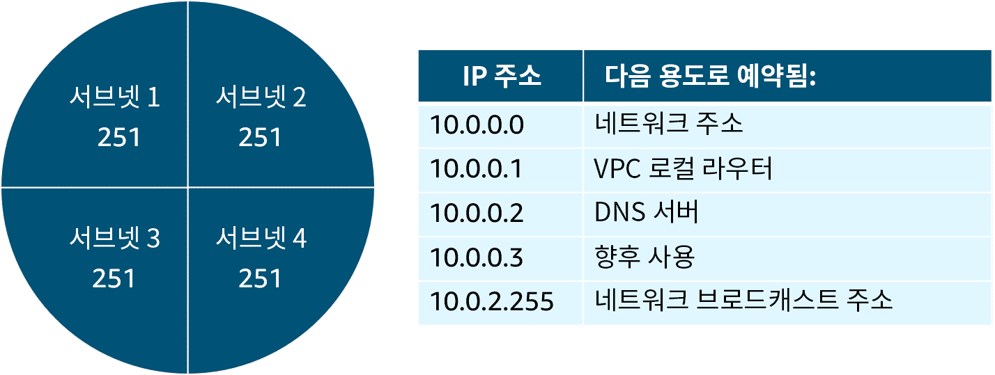 예를 들어 IP 범위가 10.0.0.0/22인 VPC가 있다면, 이 VPC에는 총 1,024개의 IP 주소가 포함된다. 이 VPC는 동일한 크기의 서브넷 4개로 나뉘며, 각 서브넷에는 256개의 IP 주소가 포함되는 /24 IP 범위가 할당된다. AWS에서 5개를 예약하므로 각 IP 범위에서 251개의 IP 주소만 사용할 수 있을 것이다.