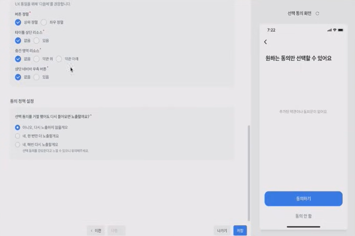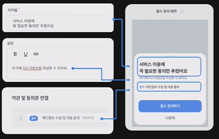 그리고 여기서 더 나아간 VER 2.0에서는 개보법, 개보시행령, 신정법, 개인정보 처리 동의 안내서, 온라인 다크패턴 자율관리 가이드라인을 녹여냈다. 특히 다크패턴을 녹였다는 게 흥미롭다. 그리고 개발적인 부분에서 업그레이드가 있었는데, 어드민을 통해 직관적인 동의화면을 만들었다는 점이다. 이렇게 되면 개발자가 코드에 입력하지 않고 모듈 ID만 호출하면 설정 값이 앱에 반영되기 때문에 휴먼에러를 줄일 수 있다. 개발자가 바로바로 결과물을 확인 가능하니 말이다. 또한, 동의화면 및 동의서 변경 필요 시 즉각 대응 가능하도록 서버 driven 방식을 채택하여 즉각 대응이 가능케 하였다. 모듈을 만들고자 한다면 이런 아이디어를 참고하면 좋을 것으로 보인다.