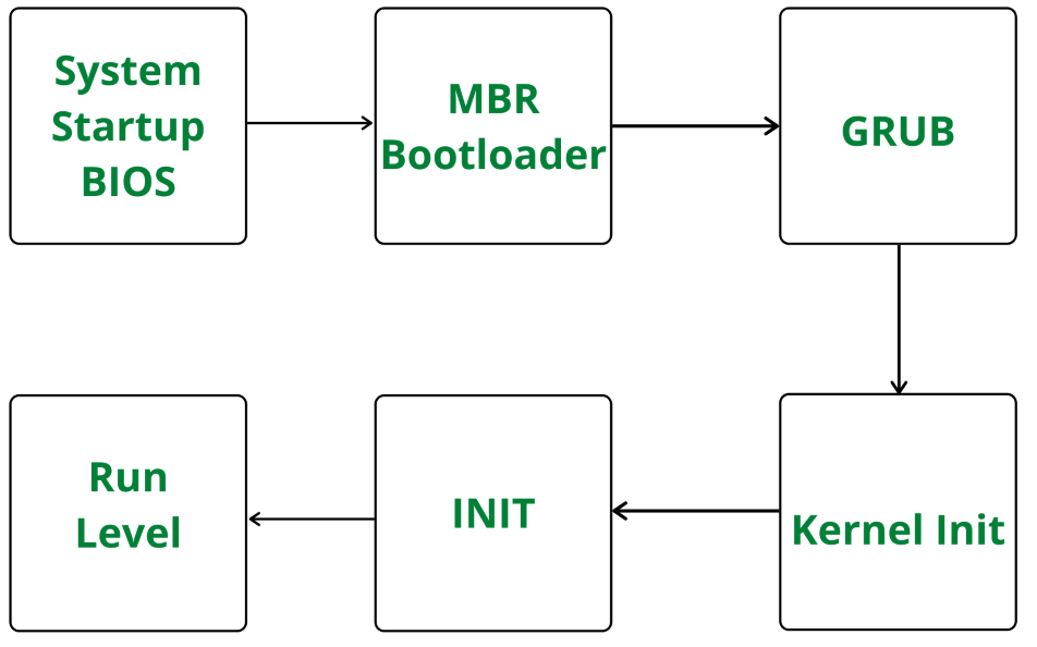 1단계 - 리눅스 서버의 전원을 켜면 ROM BIOS(Basic Input/Output System)를 읽고, 디스크의 MBR(Master Boot Record)에 있는 부트 로더를 실행한다.