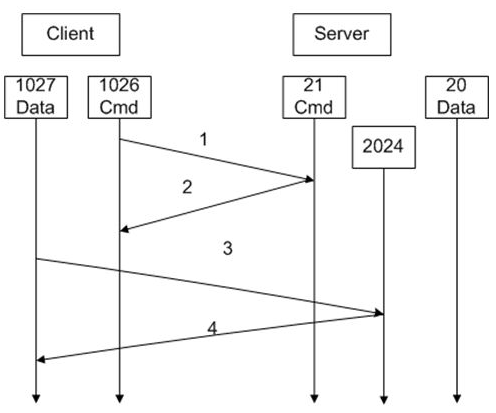 (2) 서버는 클라이언트에게 데이터 연결을 위한 두 번째 포트(TCP/1024 이상 65535 이하)를 알려준다.