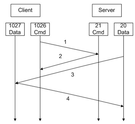 (1) 클라이언트는 서버의 TCP/21번 포트로 접속 후 두 번째 포트를 질의한다.