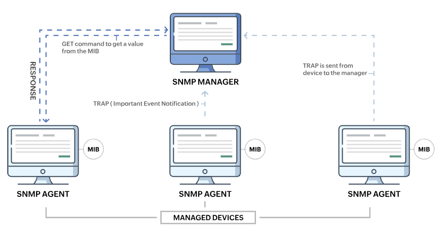 SNMP는 위의 그림에서 알 수 있듯, Manager와 Agent로 구분된다. 매니저는 에이전트로부터 받은 정보 요청에 응하고 정보를 전달한다. 여기서 에이전트는 SNMP를 사용할 수 있는 모든 장치를 말하며, 에이전트로부터 받은 정보들을 시각화하여 운영을 더욱 안정적으로 할 수 있는 것이다.